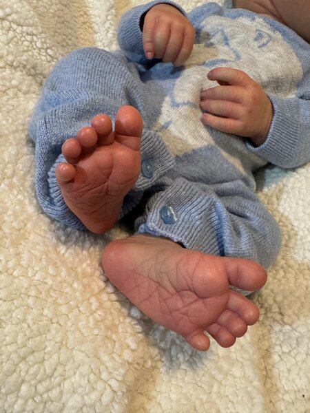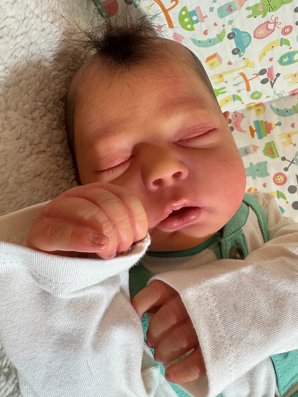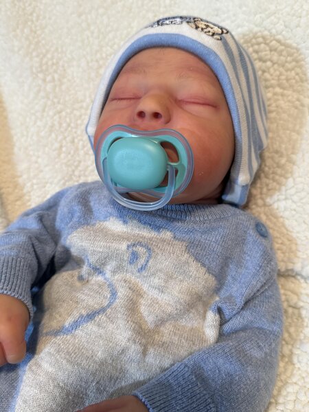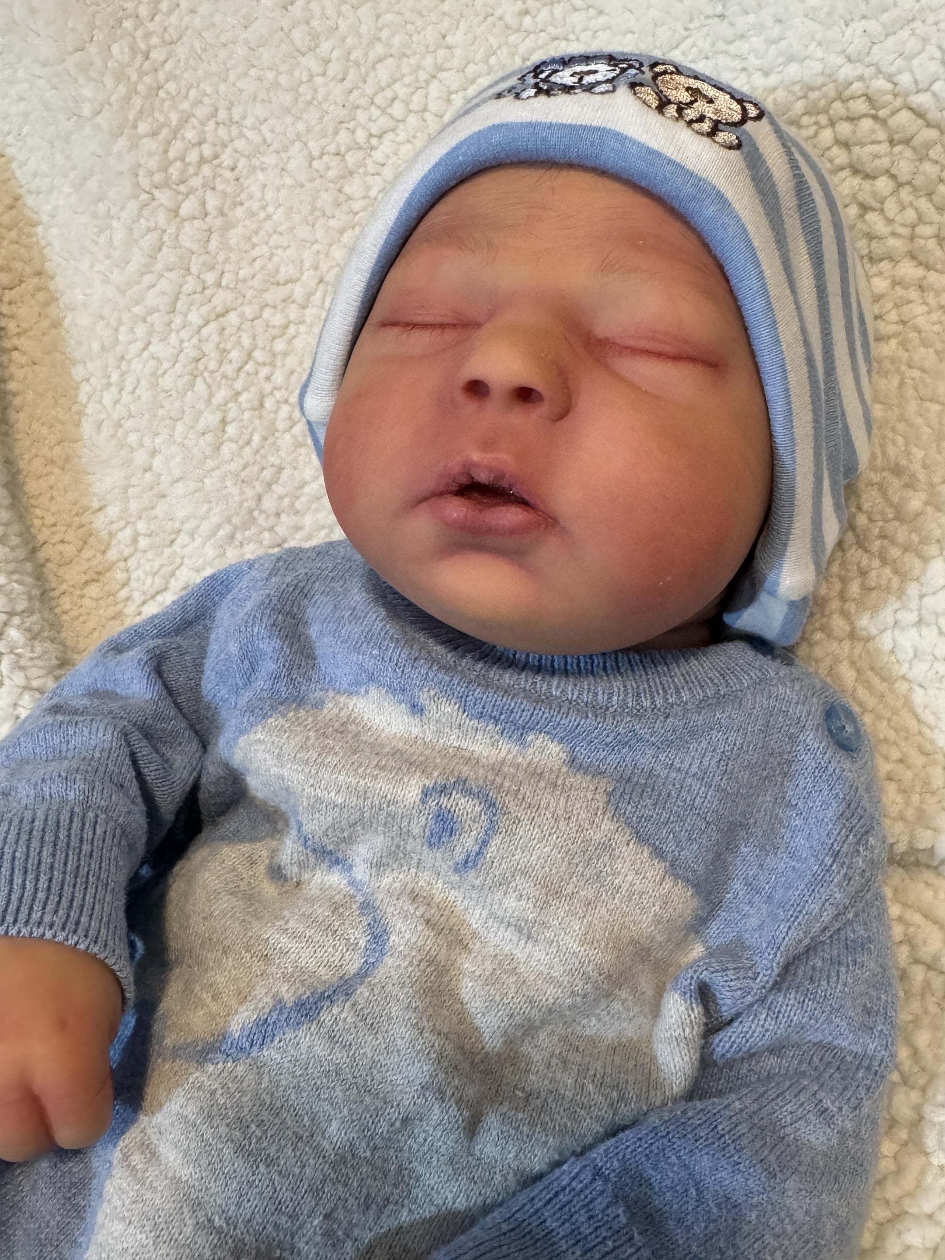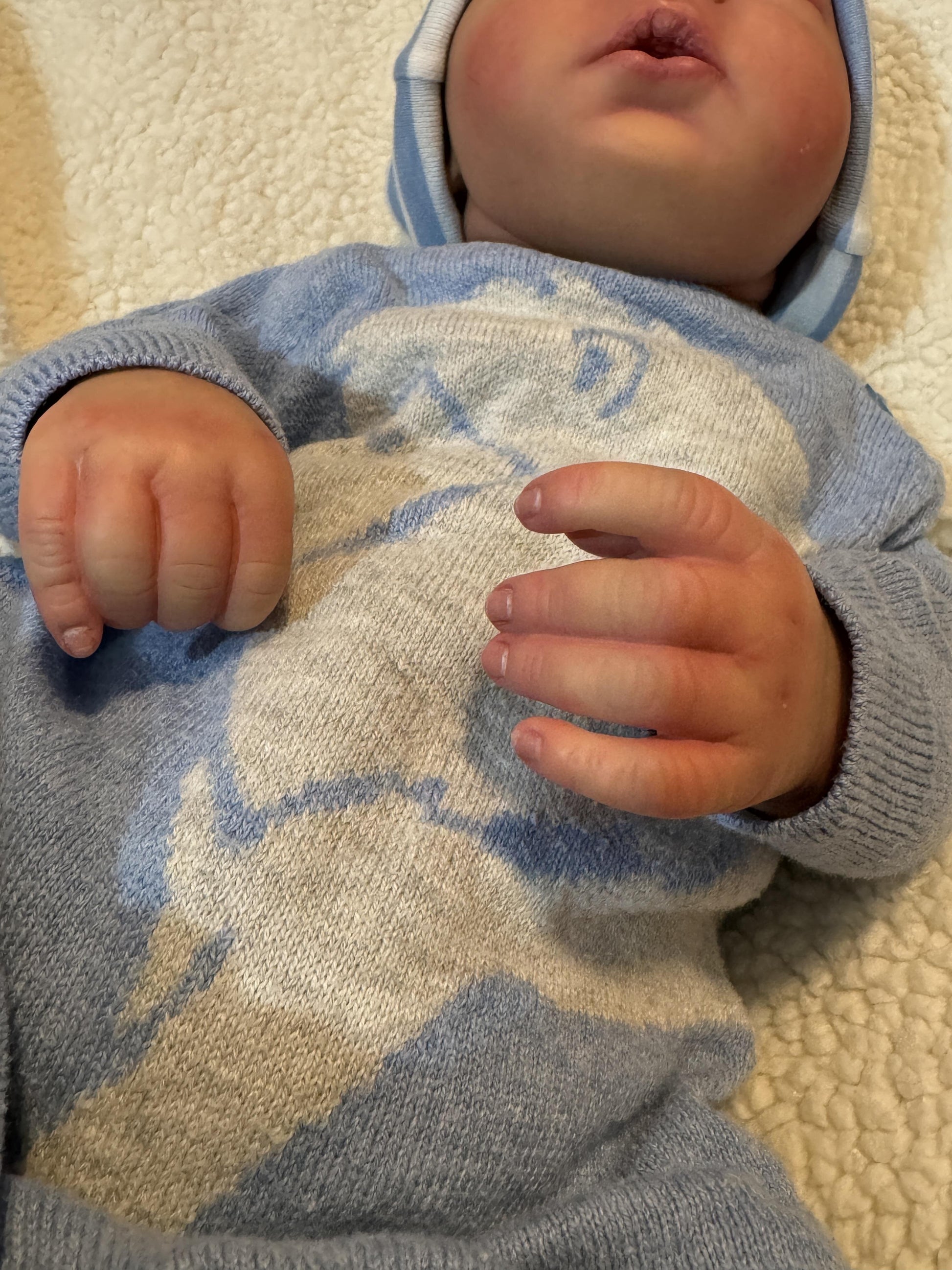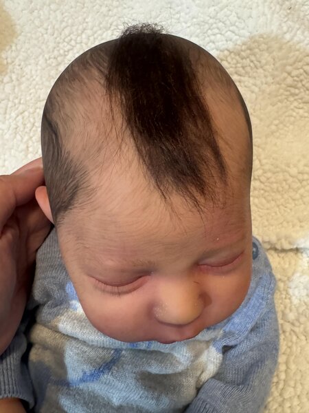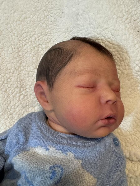 Meet Dustin, a precious reborn baby sculpt from Bountiful Baby, lovingly painted by Little Mad Nursery (We are not affiliated with the artist!) This sweet newborn is approximately 20 inches long and weighs around 6 lbs, wearing newborn size clothing for the perfect cuddle feel. He features combi hair (a combination of painted and rooted hair) and rooted eyelashes for added realism. He does have a COA which will be sent to the winner as well.